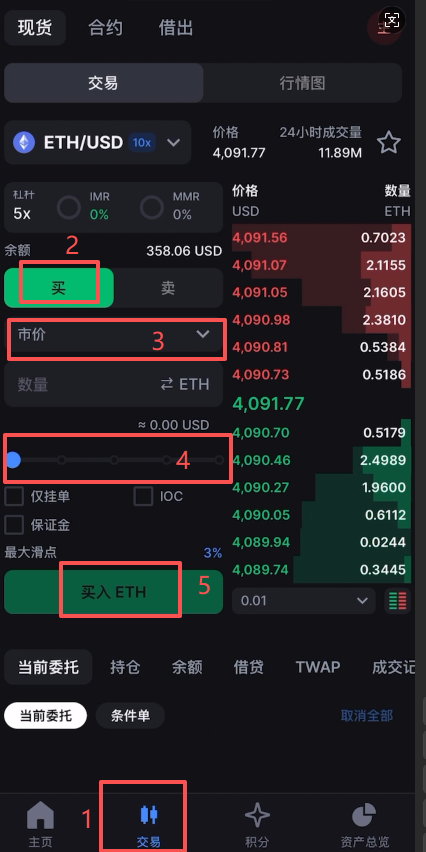 我们回到‘交易’,选择【现货】,选择【买】,还是“ETH/USD”这个交易对。我用市价全部买入。
