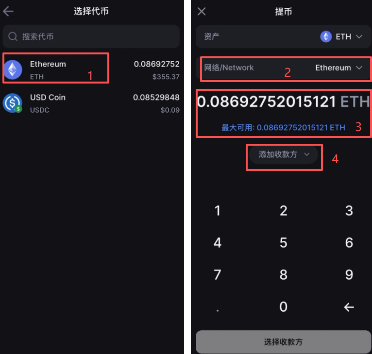 资产这里我们选择以太坊,网络又变成了它自带的以太坊网络。提现数量这里我选择最大,点击下方的【添加收款方】。