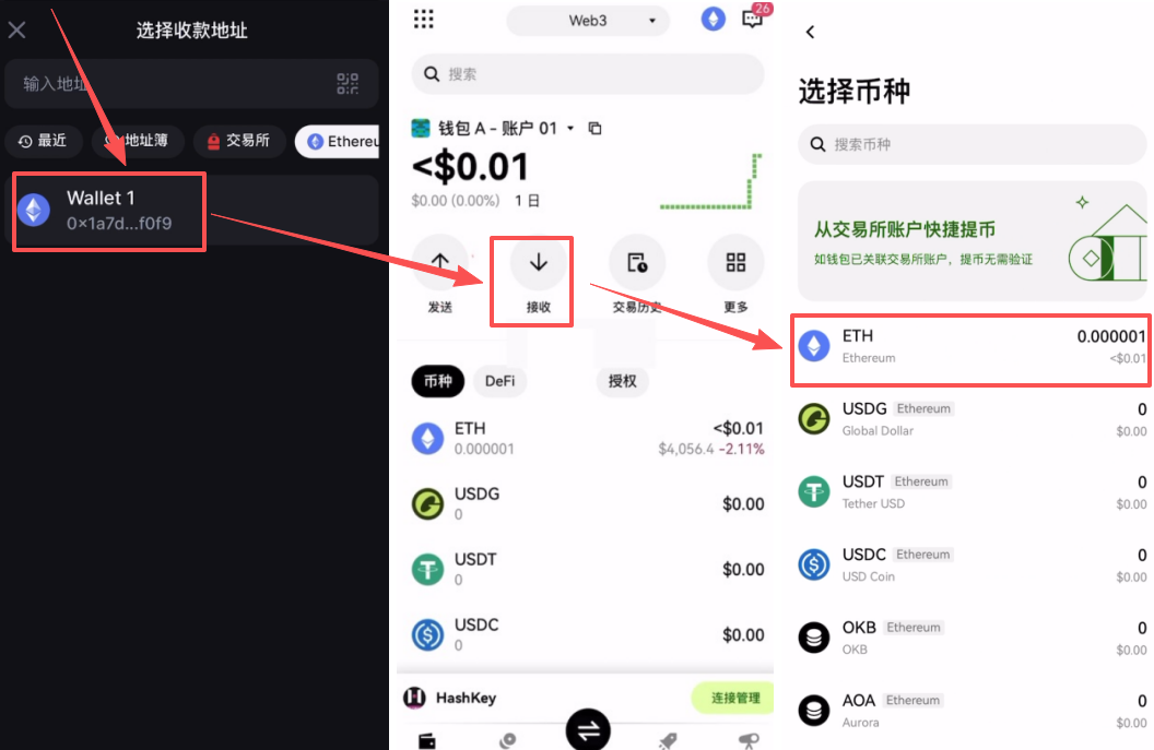 我现在就回到OKX Web3钱包,我们现在的以太坊终于到我们自己的钱包,我们就完成了刚刚所说的,把港币换成数字货币,然后再把数字货币提到钱包的流程。