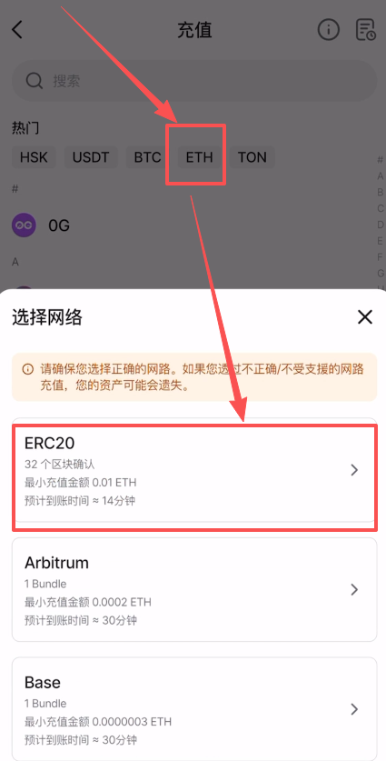 在这里就可以输入我们的充币地址,我们就填写刚刚添加过白名单的,我的OKX Web3钱包的充币地址。然后回到欧易选择【接收】,币种选择以太坊。