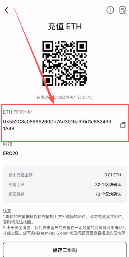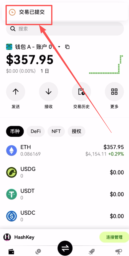 因为我的这个地址在Hashkey里面添加过白名单,所以我们就拿这个地址来当中介使用,来当一个桥梁去使用。等我们的钱到了这个钱包地址之后,我们就能够把这个钱包地址里面的以太坊再转到Hashkey里面了。