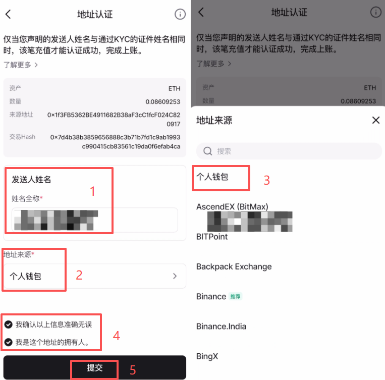 回到Hashkey,到账之后它会有一个充值上账的过程,也就是地址认证。有一个发送人姓名跟我们KYC的姓名是一致的。“地址来源”这里我们就可以直接选择“个人钱包”。勾选之后,点击【提交】。