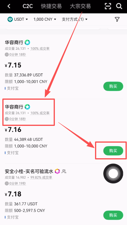 然后欧易平台就会为我们筛选出符合要求的商家了,我们要找成交量和成交率高的商家来进行购买,因为成交量和成交率高的那些商家,他们是比较有实力的商家,我们来看一下。比如说“华容商行”这一家,他有一个26000单的成交量,同时他的好评率是100%,我们就可以跟这家来进行购买。点击后面的【购买】。