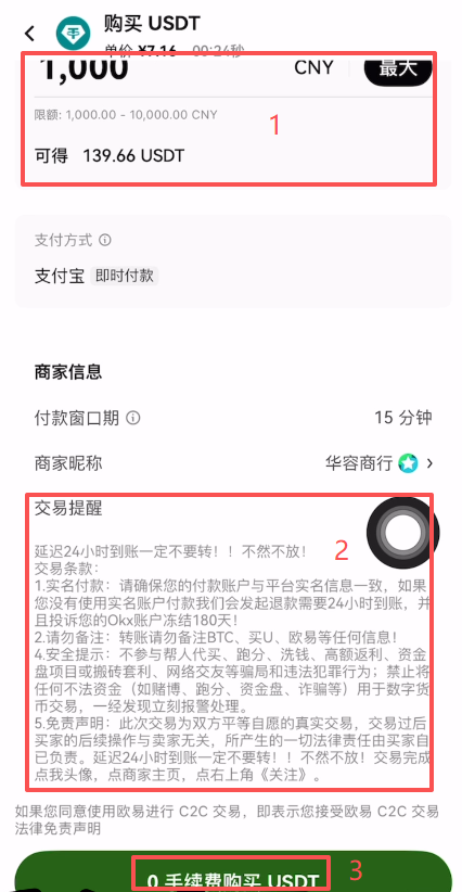再次输入一下要购买的金额,然后它会自动为我们算出来,我们支付1000人民币将收到139.66颗USDT。在下方看一下商家的交易提醒,他告诉我们一定要实名一致付款,如果没有实名会让我们退款的。买币的时候不要有任何备注,也不要帮别人去代买。看完之后我们点击下方的【0手续费购买USDT】。