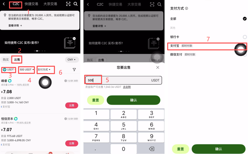 以上就是我们入金的方式,如果你想要进行出金也很好操作。我们还是在C2C交易里面,在这里选择【出售】,要出售的币种同样是USDT。你可以筛选一下金额,比如说我想要卖出500人民币的USDT,我就输入500。后面同样可以选择一下你的收款方式,银行卡、支付宝还有微信支付,你可以随便来选择一下。