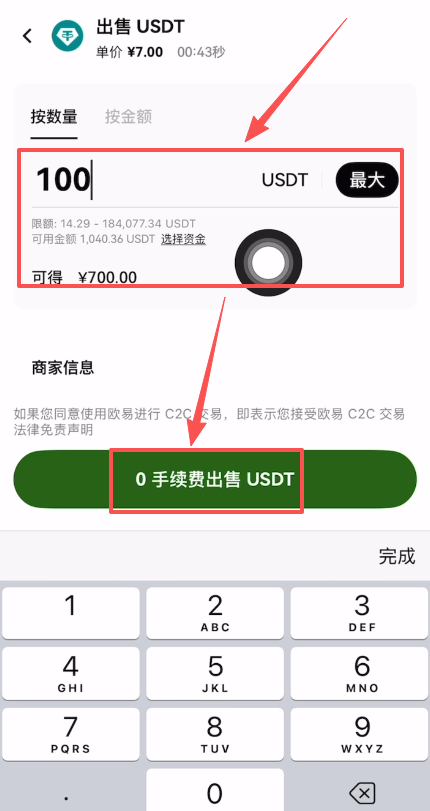 输入一下数量,比如说我出售100颗USDT。它下方会自动给我们算出来我出售100颗USDT将收到700人民币。点击下方的【0手续费出售USDT】。