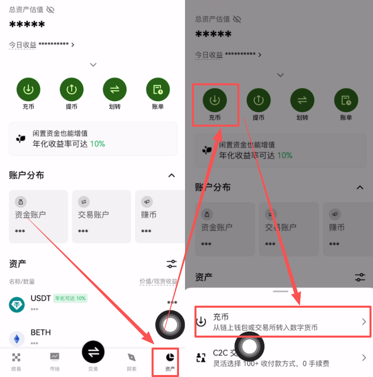 如果你想接收USDT,就需要先找到自己的钱包地址。我们点击右下角的【资产】,在上方点击【充币】,再点击【充币】。