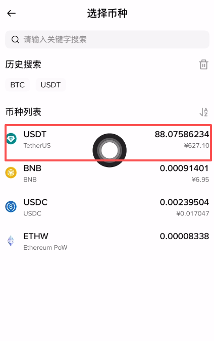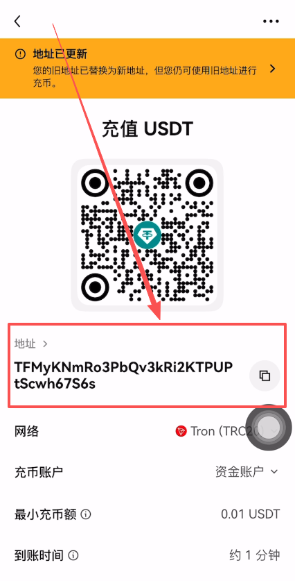 在这里就可以看到我们的充币地址了,我们就可以复制这个地址。然后打开你要转账的交易所,比如说我就以币安为例。
