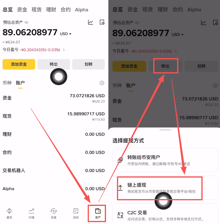 打开币安交易所之后,同样点击右下角的【资产】,然后点击上方的【转出】,选择【链上提现】。