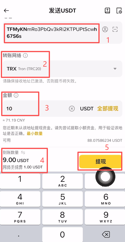 在地址这一栏粘贴我们刚才复制好的欧易的充币地址,然后再选择一下转账网络,我们选择“TRON(TRC20)”的网络。然后输入一下要提币的金额,告诉我们最少是10颗USDT,比如说我就输入10。你会看到我们到账的数量预计是9颗,因为有一颗USDT是我们的网络手续费。点击【提现】。