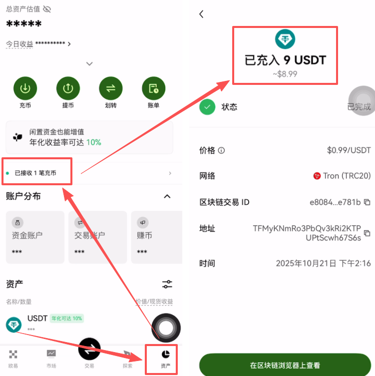 我们回到欧易交易所,点击右下角的【资产】。在这里你可以看到“已接收1笔充币”,我们点进去看一下。告诉我“已充入9颗USDT”。因为我们刚才在币安交易所转了10颗USDT,有一颗USDT是手续费,所以我们到账了9颗。这样我们的USDT就已经接收到了。