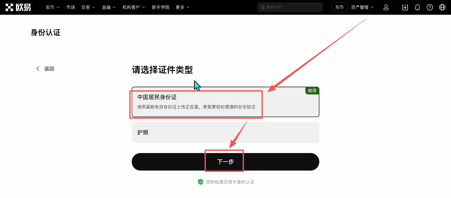 这个时候选择一下我们想要用来认证的证件类型,可以选择身份证或者是护照,我这里就选择“身份证”,点击【下一步】。