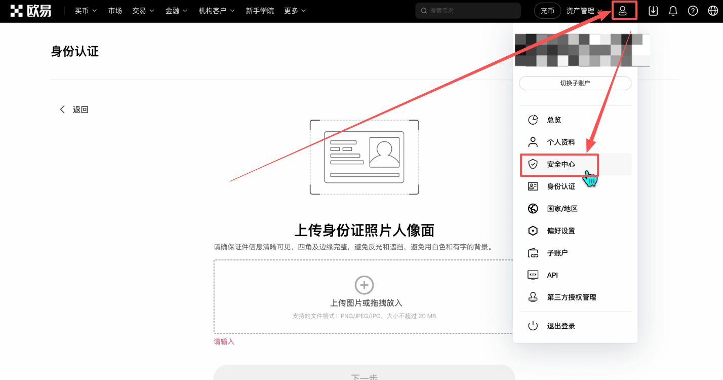 身份认证成功之后,我们可以点击右上角的小人头,找到【安全中心】。