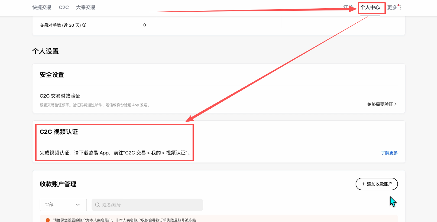 进来之后点击右上角的【个人中心】,这里可以看到“C2C视频认证”,开通了这个视频认证之后,我们能够匹配到一些更好的C2C的买卖商家。因为这些商家们他们有的会要求他的对手方必须进行视频认证,所以我们完成了它,就能够让我们获得更好的入金和出金的报价,这个也是实打实的利益。