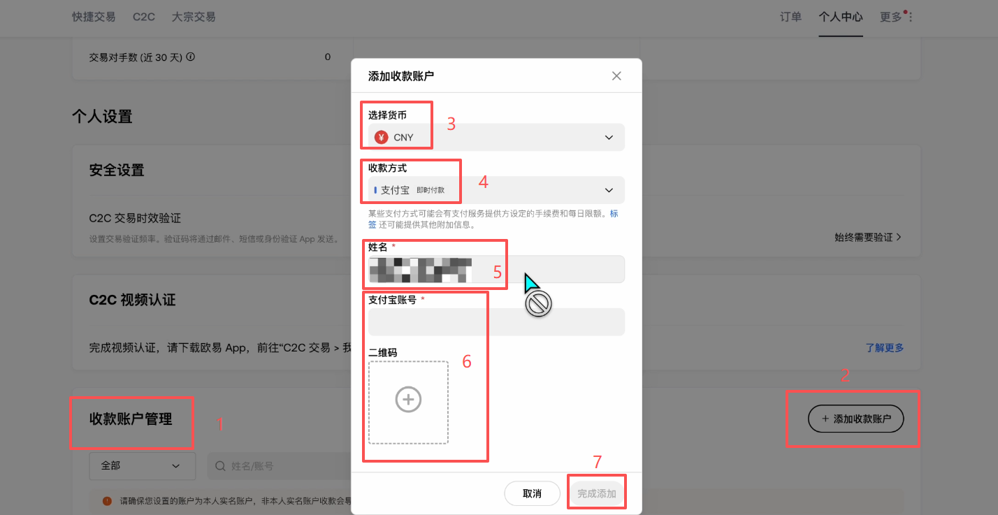 这里的姓名就是我们实名的姓名,需要我们输入的是我们的支付宝账号,以及收款二维码的截图,然后点击【完成添加】就可以了。我们收款是只能用人民币的,因为你用身份证件就是中国大陆的证件,所以你只能够用中国大陆的法定货币,也就是人民币,这个我们要知道。