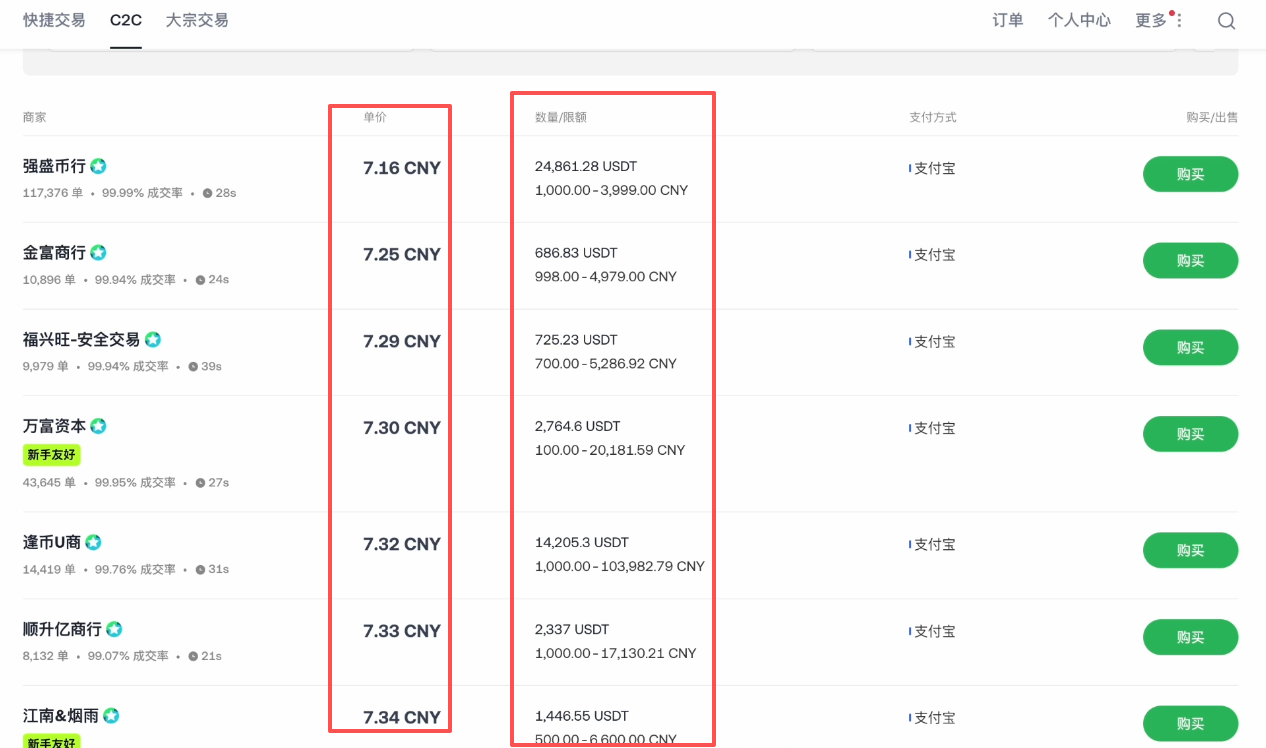 下面这些商家就是符合我们条件的商家了,我们就可以去找到一个商家去跟他交易了。可以看到这些商家他有不同的报价和不同的订单限额,这里大家需要注意,你的单笔金额最好不要超过5万,因为5万有可能触发绝大部分银行的风控系统,他对你这笔转账的风控会比较严格。支付宝、微信也是一样的,不要让自己的单笔订单超过5万。