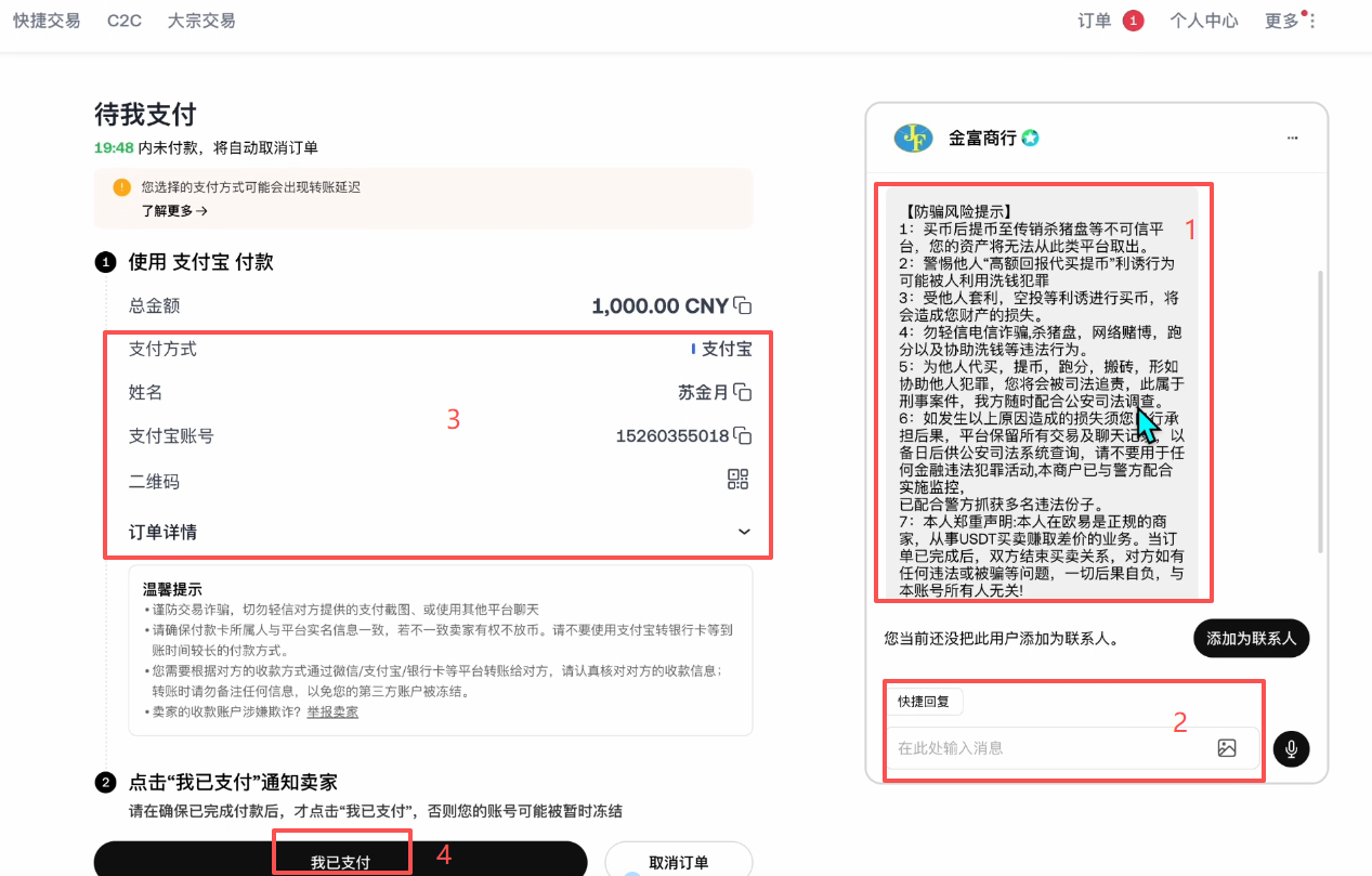 确认跟他交易,我们就可以看到左边这里,商家的姓名和他的支付宝账号,以及收款二维码都会给我们显示出来,我们就可以离开平台去到支付宝里面,根据卖家的要求以及他提供的这些信息去给他付款了。付款完成之后,一定要先点击这里的【我已支付】,通知一下卖家。卖家那边确认收到钱了之后,才会给我们放币。这样我们就完成了一个买币的流程。