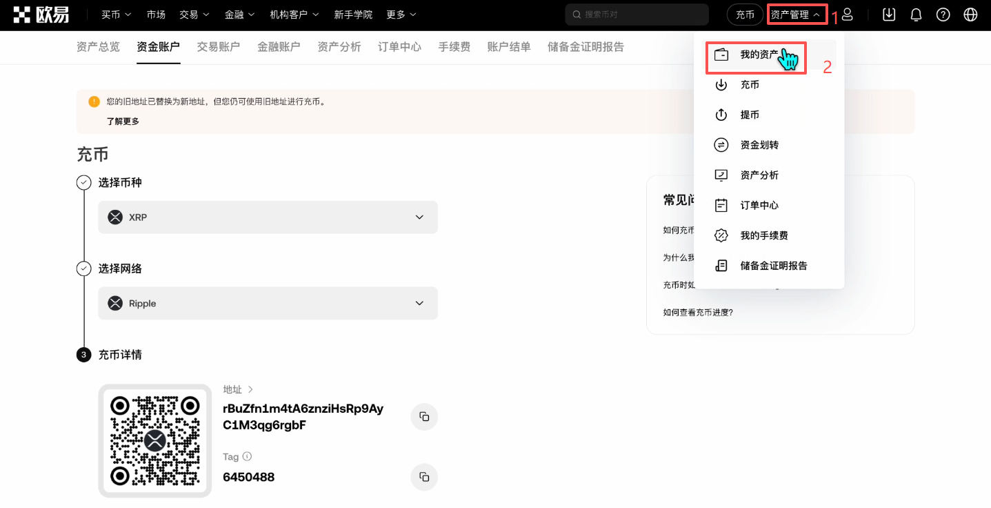 其实我们看绝大部分我们提的都是USDT这个币种,当然它还有其他的币种可以提,这里我们来看XRP这个比较特殊的币种。网络这里它有一个自己的专属网络。除了它的充币地址之外,它还有一个tag,也就是一串数字。你在其他地方提的时候,同时也要输入这个tag以及这个地址,才能够把XRP由其他交易所提到欧易交易所里面来。这个就是充币的环节。