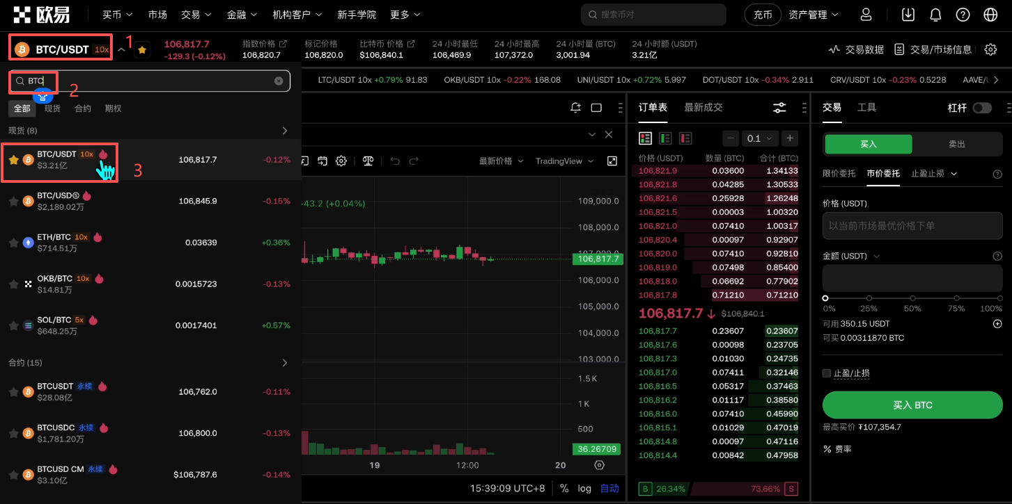 进来之后就是现货交易的页面,左上角这里显示的就是我们的交易对,如果你想要去换这个交易对,也可以在这里面去搜索。比如说我就想去购买比特币,就可以搜索“BTC”,选择“BTC/USDT”这个交易对。它的意思就是说我们既可以用USDT去购买比特币,也可以把比特币卖成USDT。这个交易在这里是可以双向进行的。