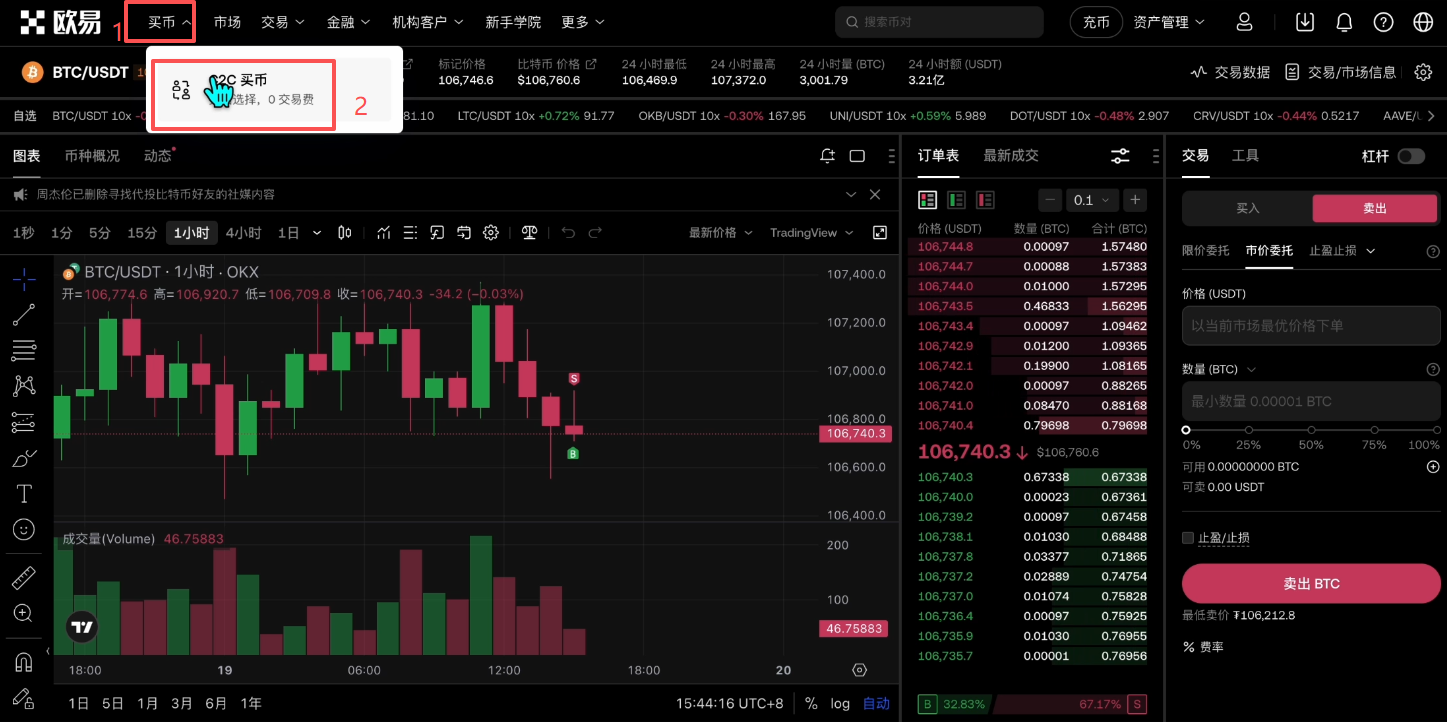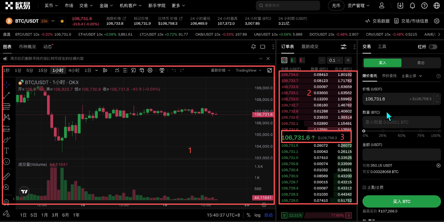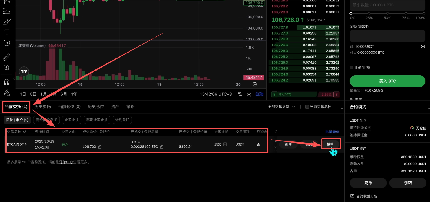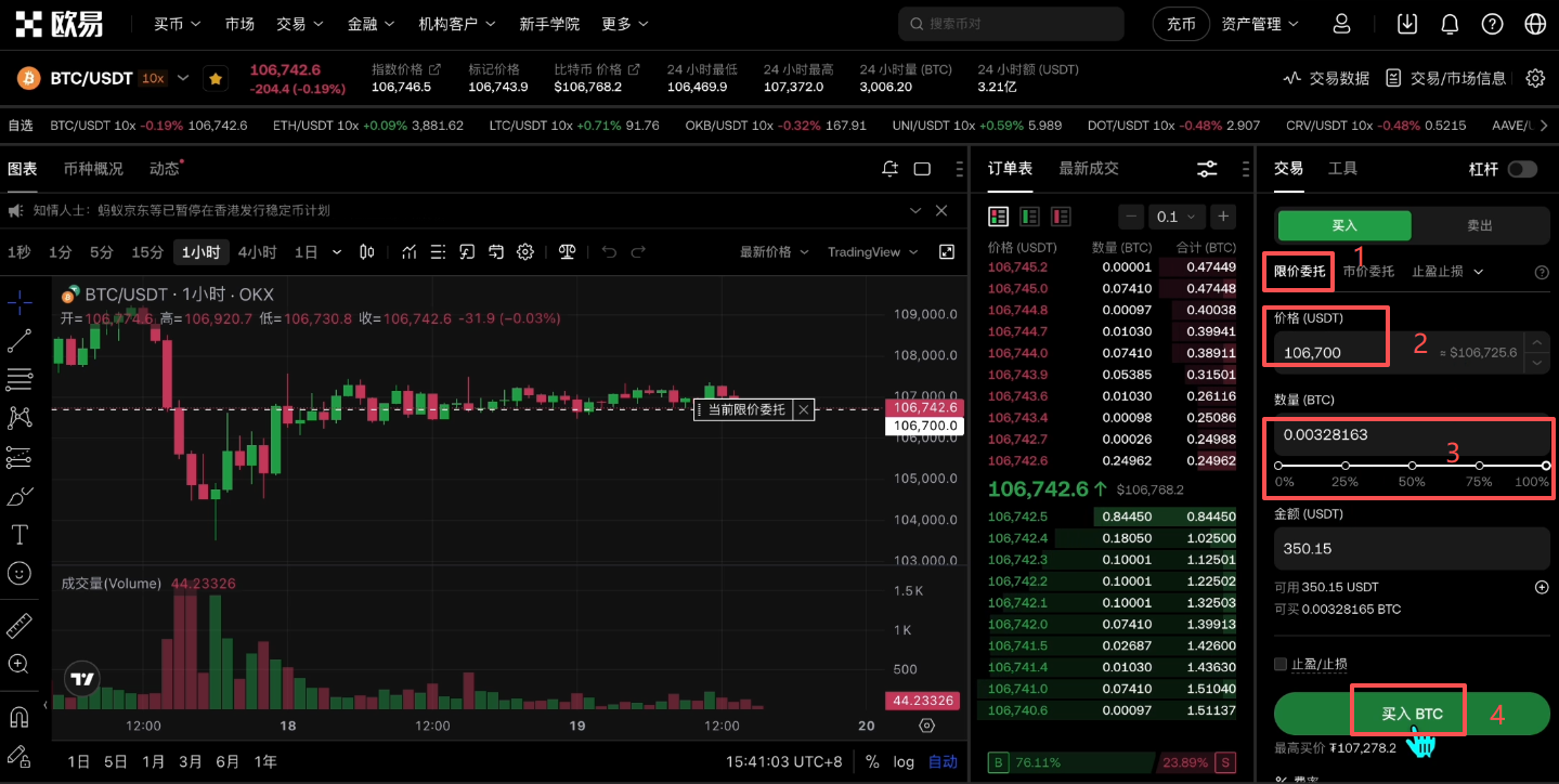 我们先来看“限价”。限价指的就是我要在这个订单列表里面,去插入一个我想要的价格,这个价格是我进行交易的理想价格。比如说现在的市价是106742,我希望等这个价格跌到106700的时候我再买入,我就可以把这个价格输入进来,然后再输入我想要去购买的数量,点击【买入BTC】。