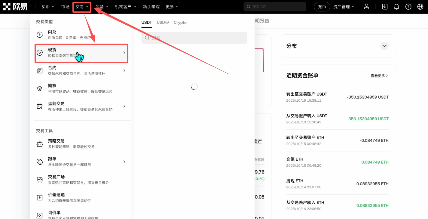 现在我的币就到了交易账户里面,我们就可以去进行交易了。点击上方的【交易】,选择【现货】。