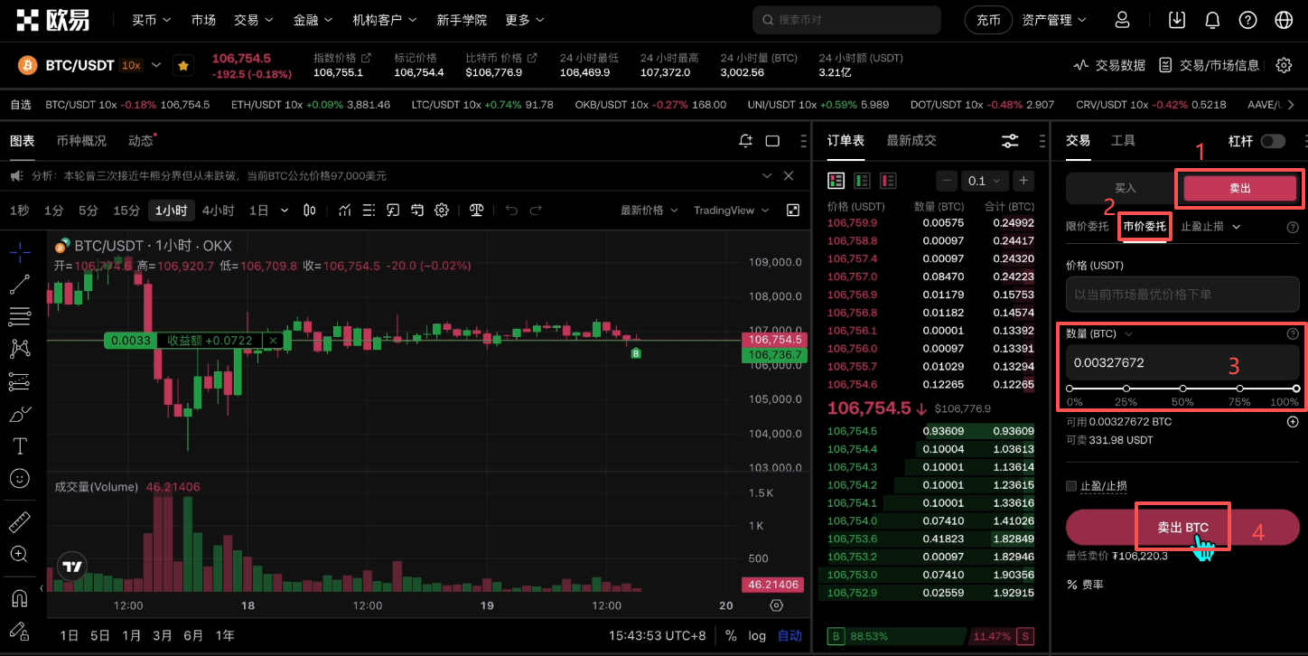 还是在这个页面,我们选择【卖出】。还是以“市价”。数量拉满,点击【卖出BTC】。这样我们就以最优的价格把比特币全部卖出了。