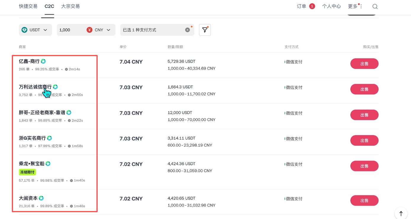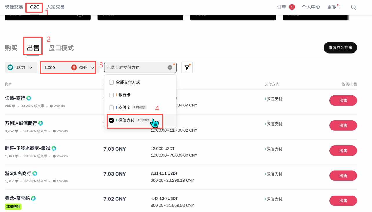 这时候我们还是使用C2C交易,选择【出售】的模式。接下来再筛选一下我们想要出售的金额,比如说我这里还是想出售1000人民币的USDT。收款方式这里我选择用微信来进行收款。