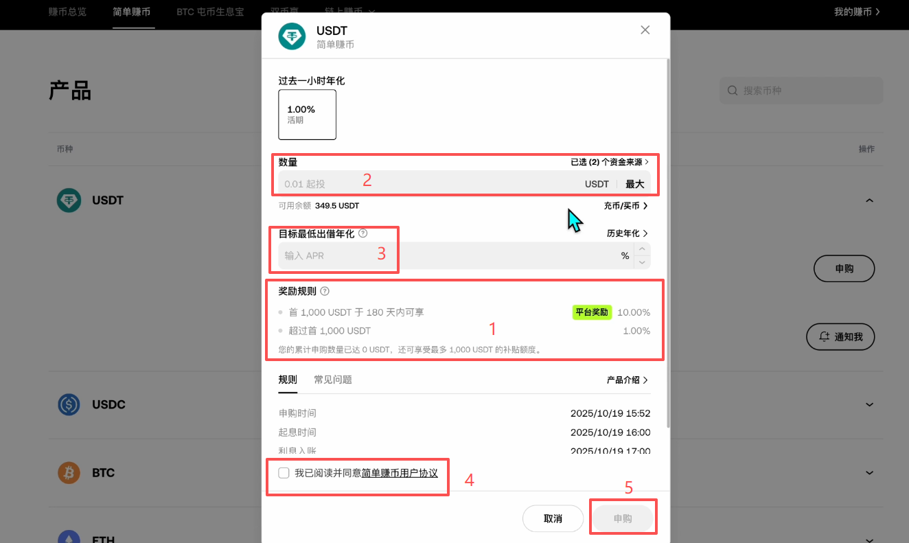 如果你的资产放在账户里面没有什么用,你就可以拿来做这个项目,它这里也明确了它的奖励规则。1000U以内的USDT,我们申购之后可以拿到10%的年化利率。而超过1000U的部分只有1%。所以如果你想要参与这个简单赚币的项目,建议大家只拿1000U出来,去赚USDT的利息。而超出来的部分你就可以拿去做USDC的赚币,这样可以保证我们的收益最大化。