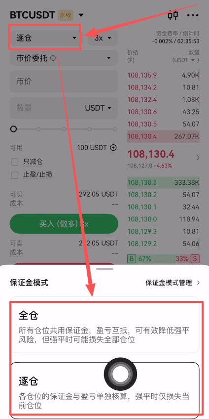 划转完成之后我们回到上方,在“逐仓”这里我们可以看一下,它有全仓和逐仓。“全仓”的意思就是你钱包里面左右的资金当做你的保证金,所以你有可能会损失掉你钱包里面所有的资金。“逐仓”就是开多少保证金,一旦爆仓之后,不会牵连账户里面其他的资金。所以一般我都是使用逐仓。