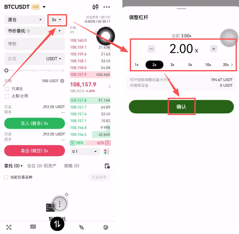 旁边的3X就是杠杆,它最高可以开到100倍的杠杆。当然高杠杆就代表这高风险,所以我基本上都会选择5倍以下,一般都是2-3倍。比如说我选择2倍,点击【确认】。