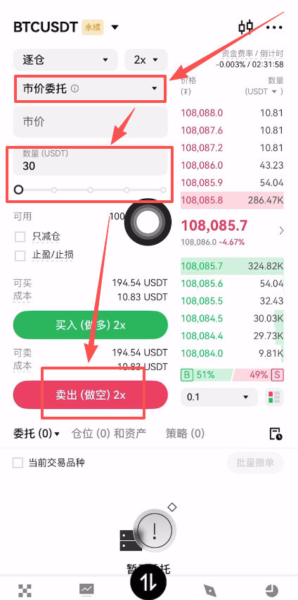 我再来给大家演示一下市价,“市价”就是可以直接成交。比如说这个时候我还是输入同样的数量,点击【卖出做空】。