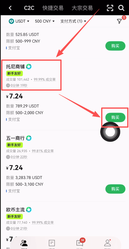 接下来我来给大家演示一下。你可以看到欧易平台会给我们筛选出来了,所有的新手友好委托单的商家,他会前面带一个标志“新手友好”。我们还是要找成交量和成交率高的商家来进行购买,因为成交量和成交率高的那些商家,他们是比较有实力的。
