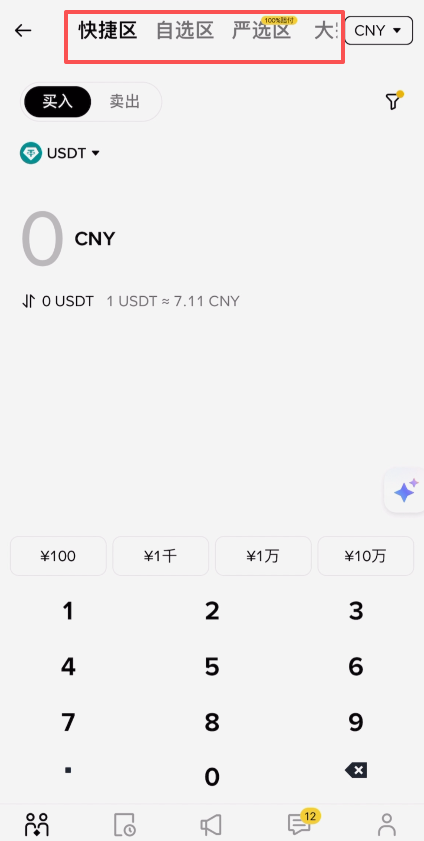 “严选区”它是专门针对于出金的。所以我们买币的时候一般都是使用快捷区或者自选区。接下来我就以更加具体的自选区为例,来给大家演示一下如何买币。