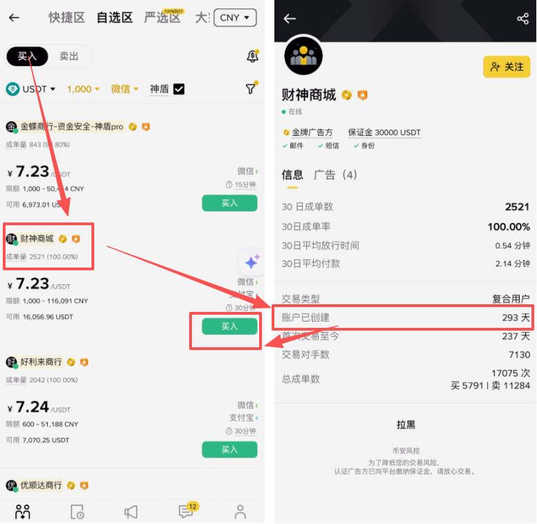下面这些就是符合条件的商家了,我们就可以去选择一个商家去跟他交易。选择商家首先我们要看他的成单量和成交率都是越高越好。然后点开他的主页,查看一下他的账户已创建时间,越久越好,至少要是半年以上的。因为他的账户存活的时间越久就证明他的资产越安全,交易了这么长时间以来,没有出现过什么问题。确认跟他交易之后我们点击【买入】。