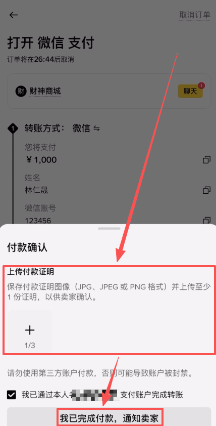 在这里上传一下我们的付款截图,然后点击下方的【我已完成付款,通知卖家】。卖家那边收到钱了之后就会把币放给我们了。