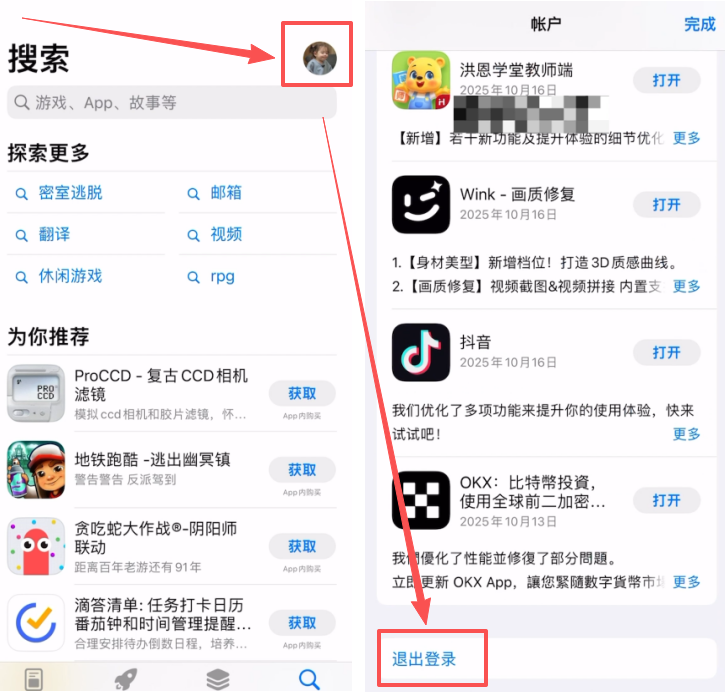 购买完Apple ID之后,我们打开Appstore,在搜索的页面点击右上角的小人头。往下倒,点击【退出登录】。