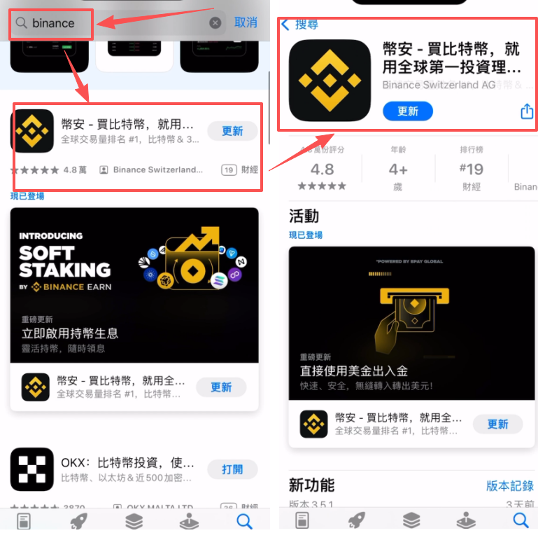 登录号之后我们再去搜索“binance”,第一个是广告我们不用管他,直接看到第二个。这个就是币安的APP了,我们直接下载它就可以了。