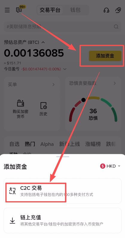 接下来我们就可以去购买加密货币了。点击首页这里的【添加资金】,选择【C2C交易】。