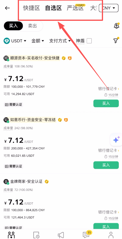 这里有快捷区、自选区、严选区还有大宗区,四个区域可以选择。大宗区、严选区和自选区他们三个是比较类似的。“大宗区”一般是针对于大额的交易。“严选区”是针对于我们的出金。
