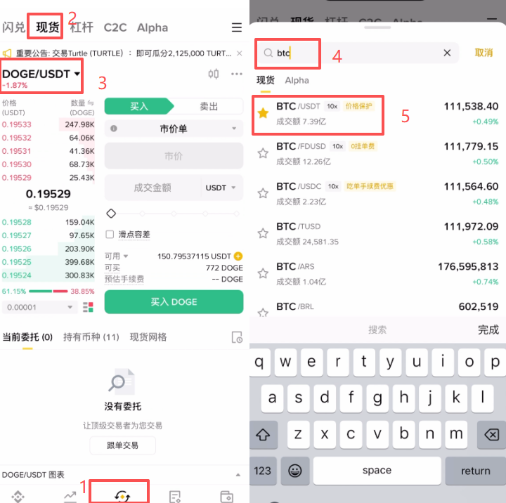 划转成功之后我们点击下方的【交易】,在“现货”交易的这个页面,左上角这里可以选择我们想要进行的交易对,比如说我想去购买比特币,那我就搜索“BTC”,然后选择“BTC/USDT”这个交易对。