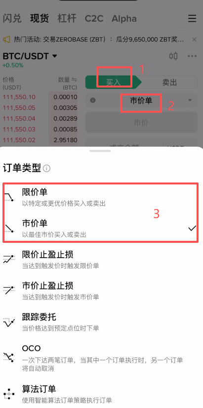 接下来在买入的界面,我们可以选择使用市价单或者是限价单。