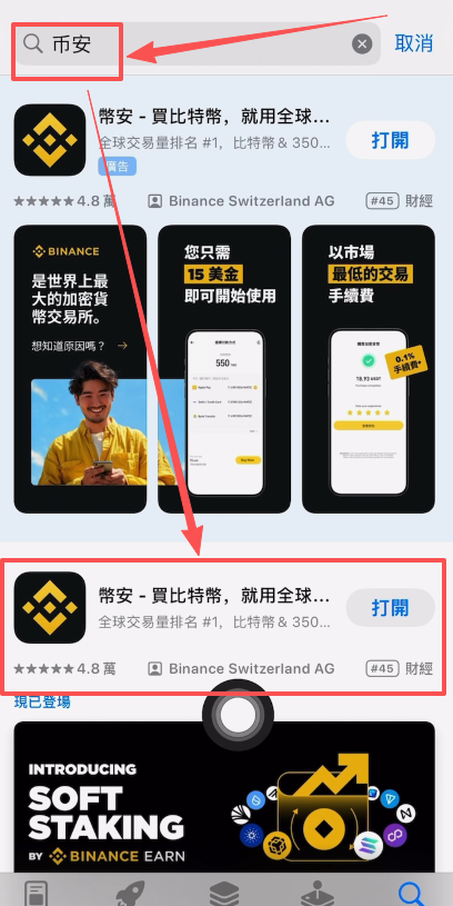 你换登完成之后,就可以搜索币安了。可以看到我们是可以搜出来的。
