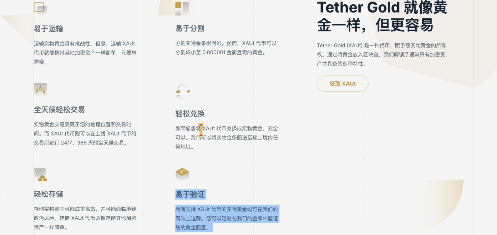 以往我们购买黄金都是在金店里面购买真实的实物黄金,要么就是在银行或者是其他渠道上购买黄金。我们线下购买黄金大家都知道黄金有各种造假的手段,一般人很容易被骗。如果你在银行或者其他渠道线上买黄金,你买入卖出都有时间限制,不是24小时交易。现在你购买泰达的数字黄金,你可以在链上后者是交易所里面,实现全天24小时交易,想什么时候购买就什么时候购买。你可以一次买0.001盎司,也可以一次买1000盎司。买入之后你可以通过区块链向全世界便捷的转移,你可以随时转移给你的家人,或者是朋友。保存也是非常方便的,你可以存储在链上钱包、冷钱包或者是交易所里面。