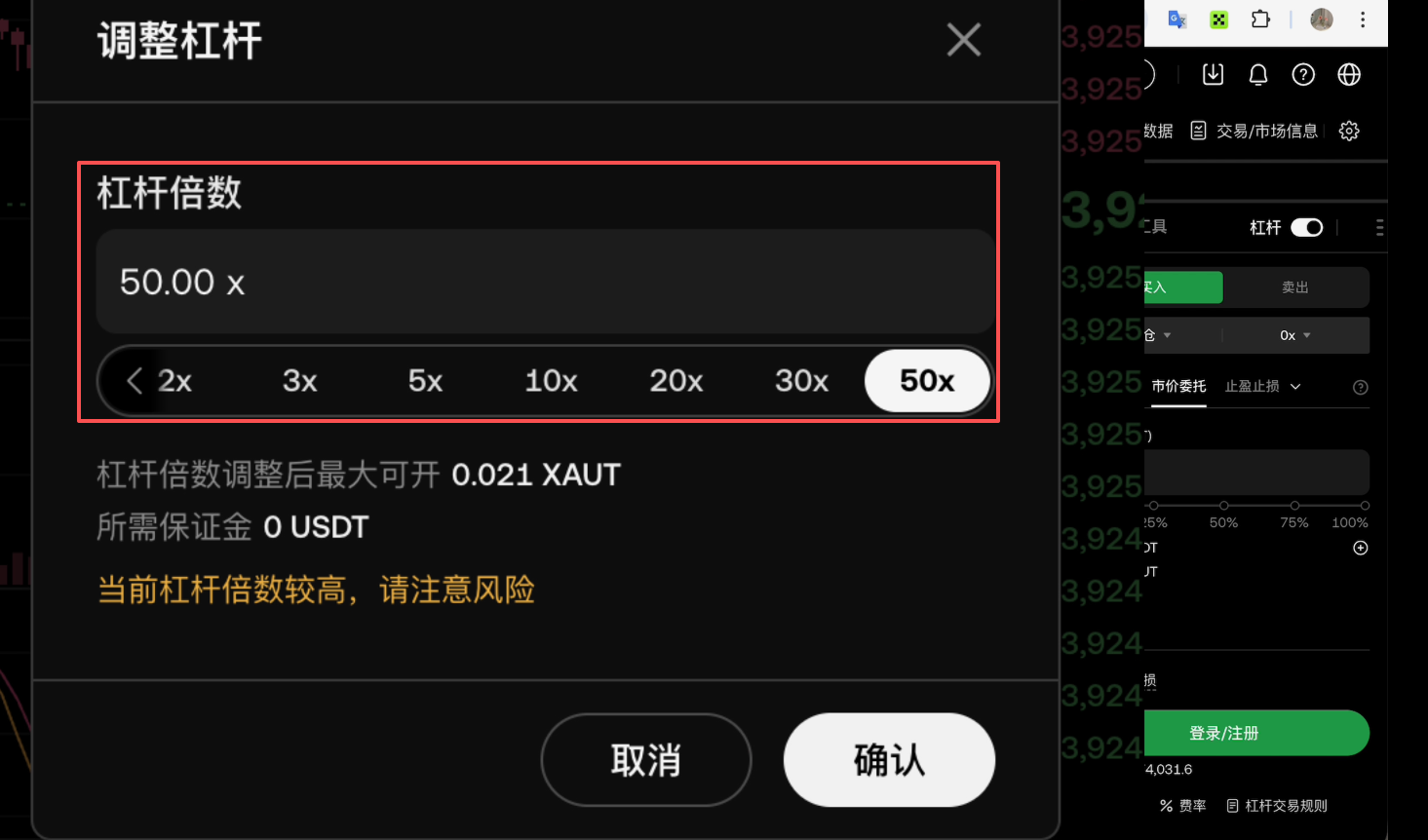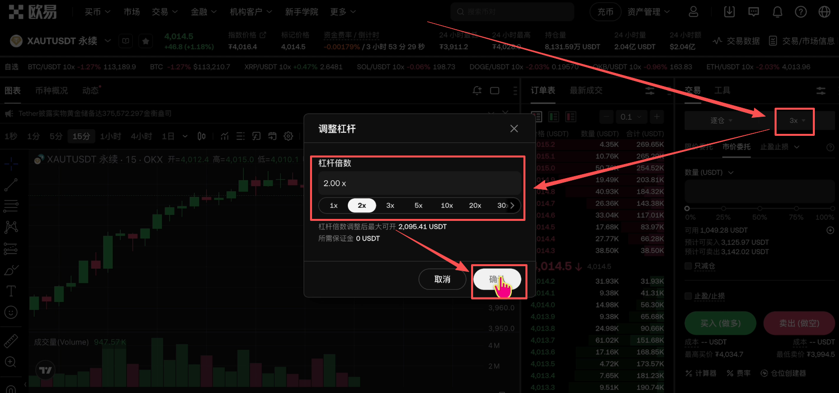 旁边的3X就是杠杆,它最高是可以开到50倍的杠杆的。当然高杠杆就代表着高风险,我们一般都会选择5倍以下,一般都是2到3倍。我这里比说就选择2倍,点击【确认】。