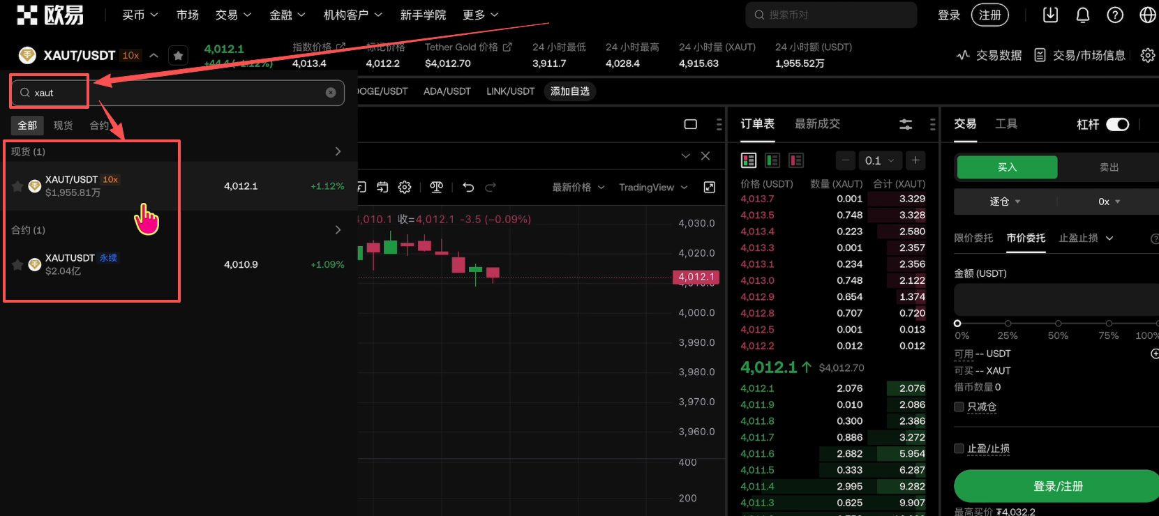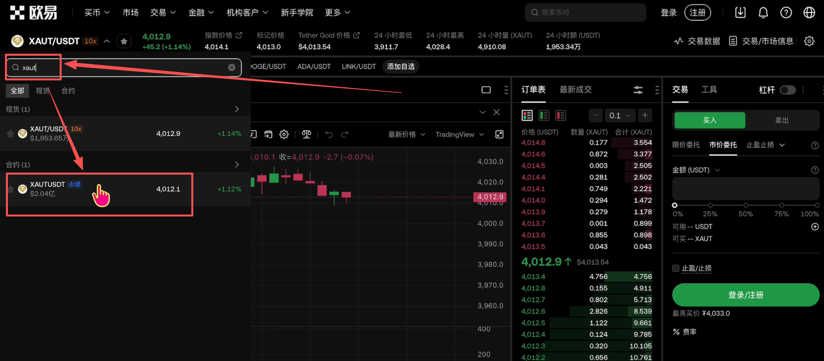 我们在欧易APP或者是网页段抖索“XAUT”,就会出现现货交易对和衍生品合约交易对。我们点击进去。