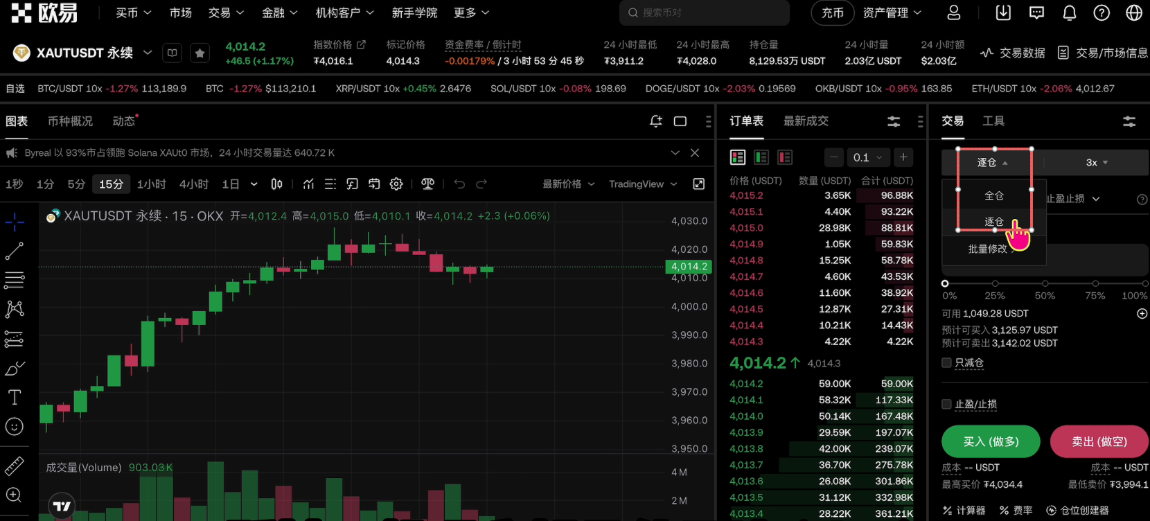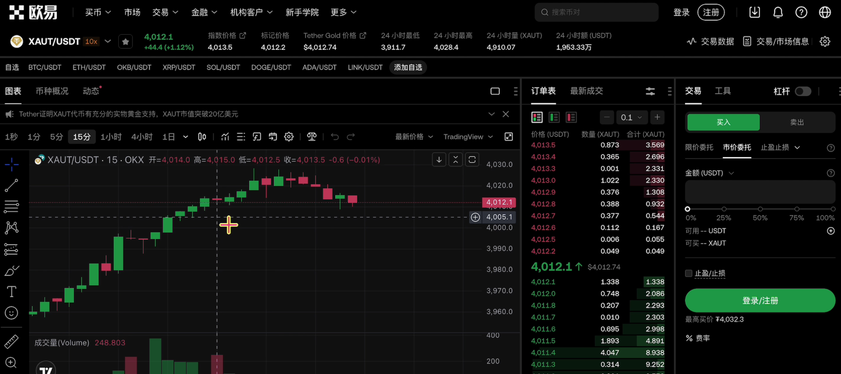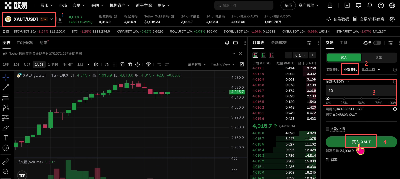 进来之后就可以去做买入和卖出的操作了。欧易里面的黄金现货是目前所有交易所中交易量最大,并且深度最好的平台,现在每天交易量大概在1亿美金左右。
