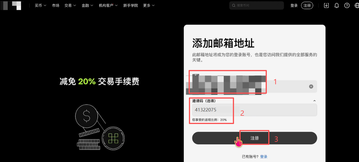 输入一下邮箱,大家可以使用Outlook邮箱、163邮箱或者是Gmail邮箱来进行注册。下方这里有一个邀请码的选填,如果您是通过我的链接进来的,这里会自动为您填写好,告诉您享受了20%的返现比例。如果没有填写,你就可以填写41322075,同样会获得20%的返现比例。点击【注册】。