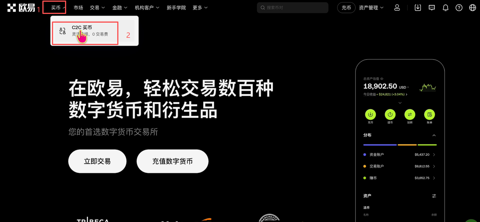注册好之后,我们就可以去买USDT了。我们在欧易首页点击左上角的【买币】,选择【C2C买币】。