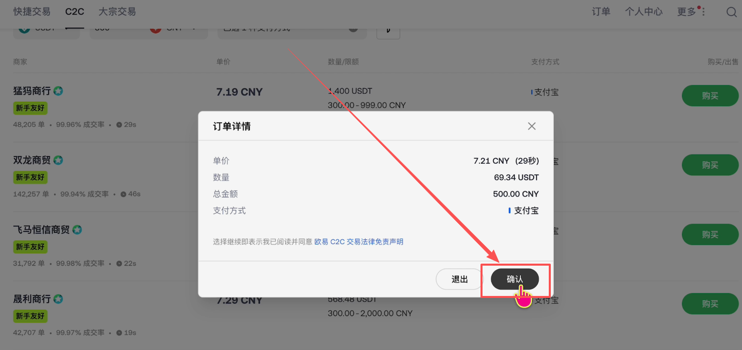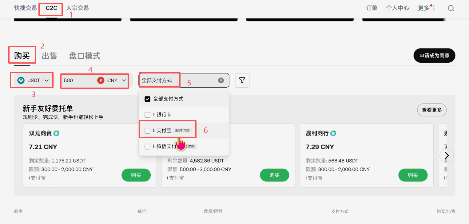 上方有快捷交易、C2C交易还有大宗交易。我们一般都是使用C2C交易,就是个人对个人交易。