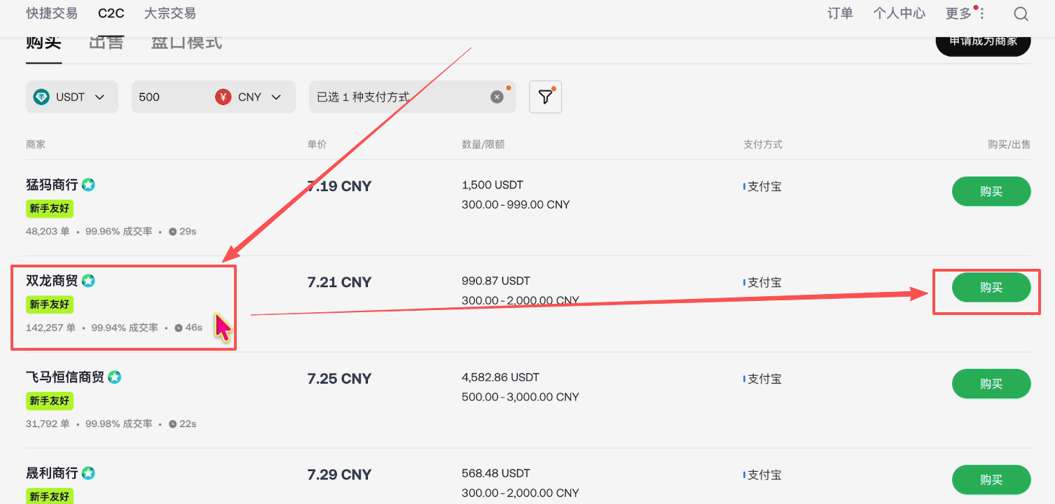 如果你是新手,可以点击旁边这个小钉子,我们勾选“新手友好委托单”。他就会为我们推荐新手友好的商家。这里都标了新手友好的商家,这些就是欧易为我们筛选出来的新手友好的商家了。我们要找成交量和成交率高的商家来进行购买。